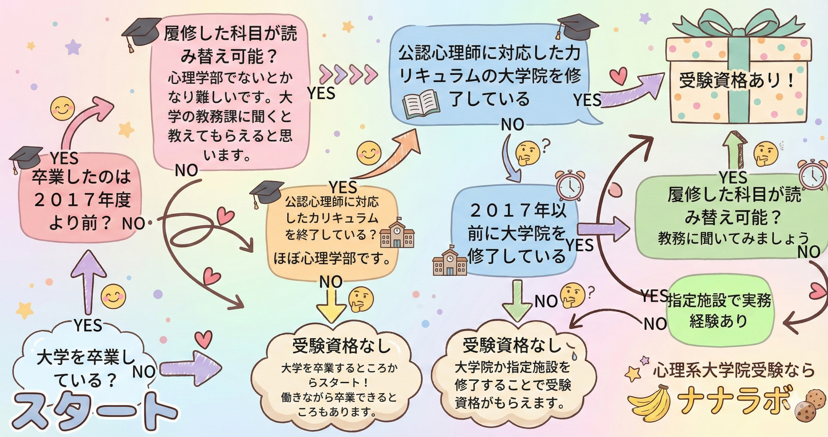 かなり複雑なのでフローチャートを作ってみました。自分の受験資格を確認してみましょう。受験資格なしだった方は、この先どうしたら受験資格が得られるのかを解説しています。